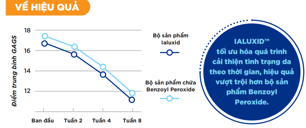 Kết luận: Cả hai bộ sản phẩm đều có điểm GAGS giảm theo thời gian, cho thấy sự cải thiện tình trạng mụn. Xu hướng điểm GAGS IALUXID™ giảm mạnh hơn sau 8 tuần sử dụng, chứng tỏ hiệu quả cao và ổn định hơn so với bộ chứa Benzoyl Peroxide. IALUXID™ chưa ghi nhận bất kỳ tác dụng phụ đáng kể nào.
