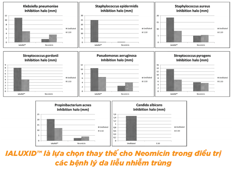 Gel IALUXID™ cho thấy hiệu quả tương đương hoặc vượt trội so với Neomicin trong việc ức chế sự phát triển của vi khuẩn và nấm, đặc biệt ở dạng không pha loãng (Undiluted) và pha loãng tỉ lệ 1:10.